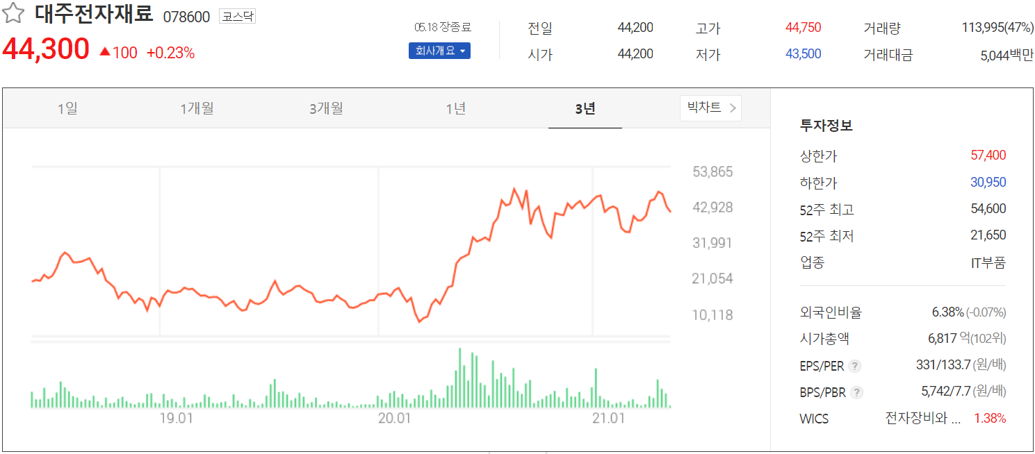 5월 18일 장 종료 기준 당사의 주가는 전 거래일보다 0.23% 오른 44,300원입니다. 외국인 비중은 6.38%이며, 시가 총액 6,817억 원으로 코스닥 시총 102위 종목입니다.