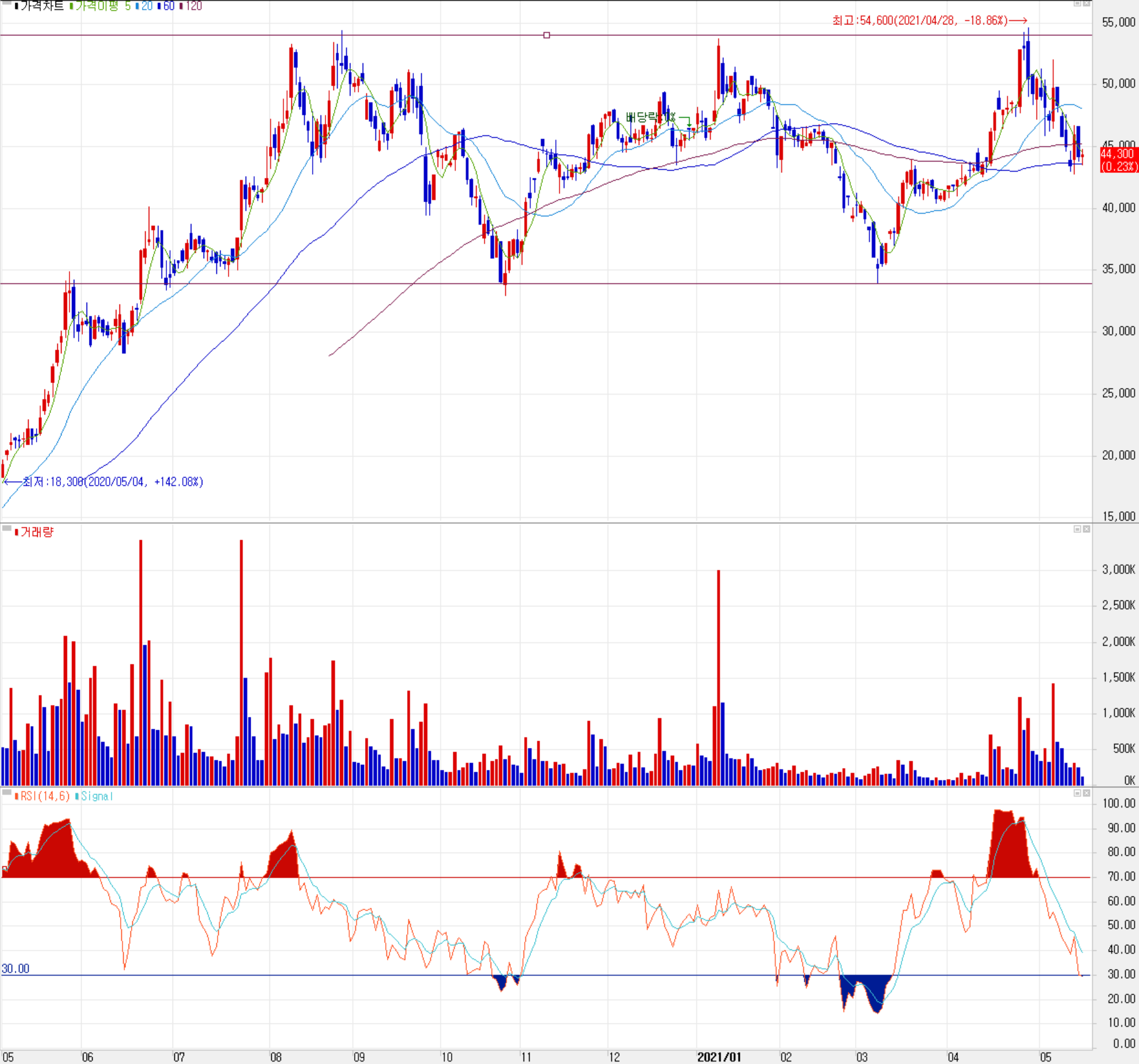 당사의 주가는 지난 4월 28일 최고가인 54,600원을 기록한 이후 최근까지 금리 인상 등의 이슈로 하락세를 보이고 있습니다. 또한 LG, SK 등 2차전지 제조사 들의 인수합병 등의 추진에 당사 주가의 변동성이 예상됩니다. 최근 한 달간 수급에서는 기관과 개인의 매수 우위 속에 외국인은 매도로 대응하는 모습입니다. 당사의 주가 추이는 큰 그림에서 보면 저점 35,000원, 고점 53,000원 사이에서 움직임을 볼 수 있습니다. 지난 분석글에서 설정한 목표 주가인 53,000원은 유지할 예정이며, 다시 진입 시기를 고려 중에 있습니다.