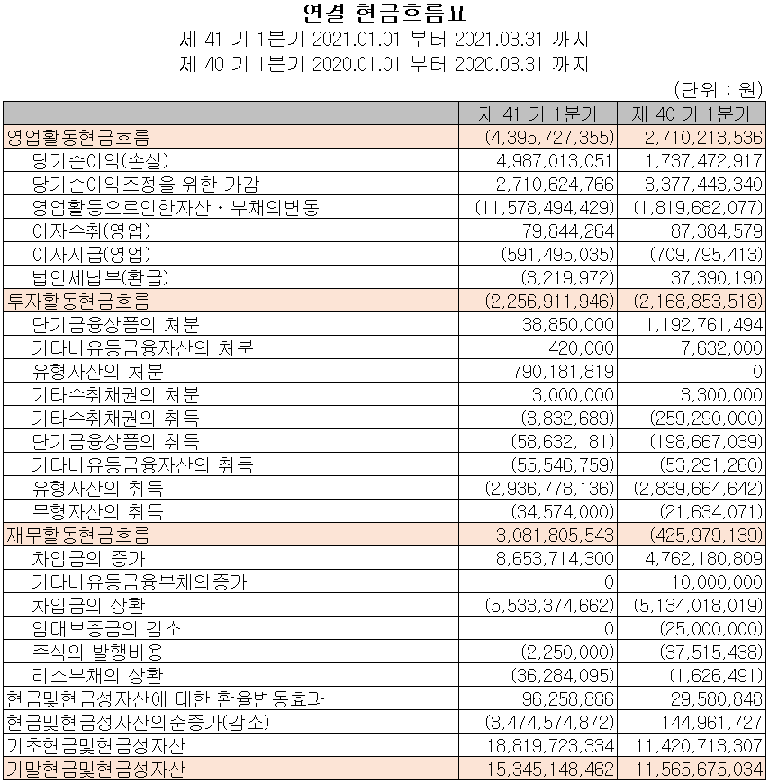 지난 1분기 영업활동 현금흐름은 매출 채권의 증가 등으로 총 44억 원의 현금이 유출되었습니다. 차입금을 조달하여 부채를 상환하고, 유무형 자산에 투자를 지속하고 있습니다. 2021년 1분기 말 기준 현금 및 현금성 자산은 전기 대비 38억 원 증가한 153억 원입니다.