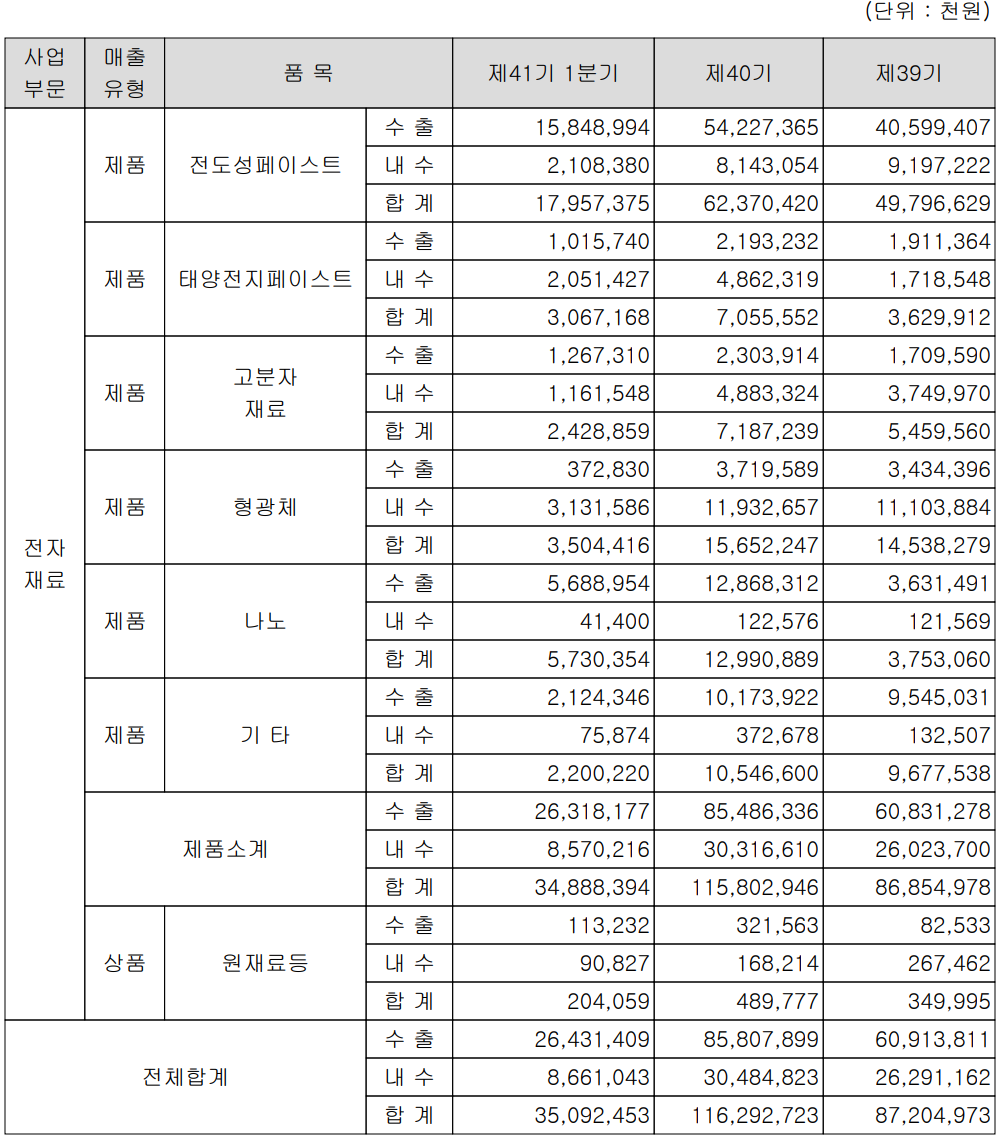 당사는 전자재료 관련 단일 사업부부문으로 MLCC(적층 세라믹 콘덴서) 칩 등에 적용되는 전도성 페이스트, 태양전지 전극 재료, LED 형광체 그리고 2차전지용 실리콘 음극재 등으로 구성되어 있습니다.