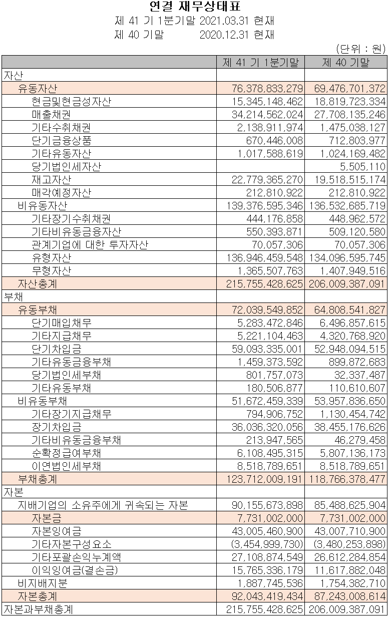 지난 1분기 영업활동 현금흐름은 매출 채권의 증가 등으로 총 44억 원의 현금이 유출되었습니다. 차입금을 조달하여 부채를 상환하고, 유무형 자산에 투자를 지속하고 있습니다. 2021년 1분기 말 기준 현금 및 현금성 자산은 전기 대비 38억 원 증가한 153억 원입니다.