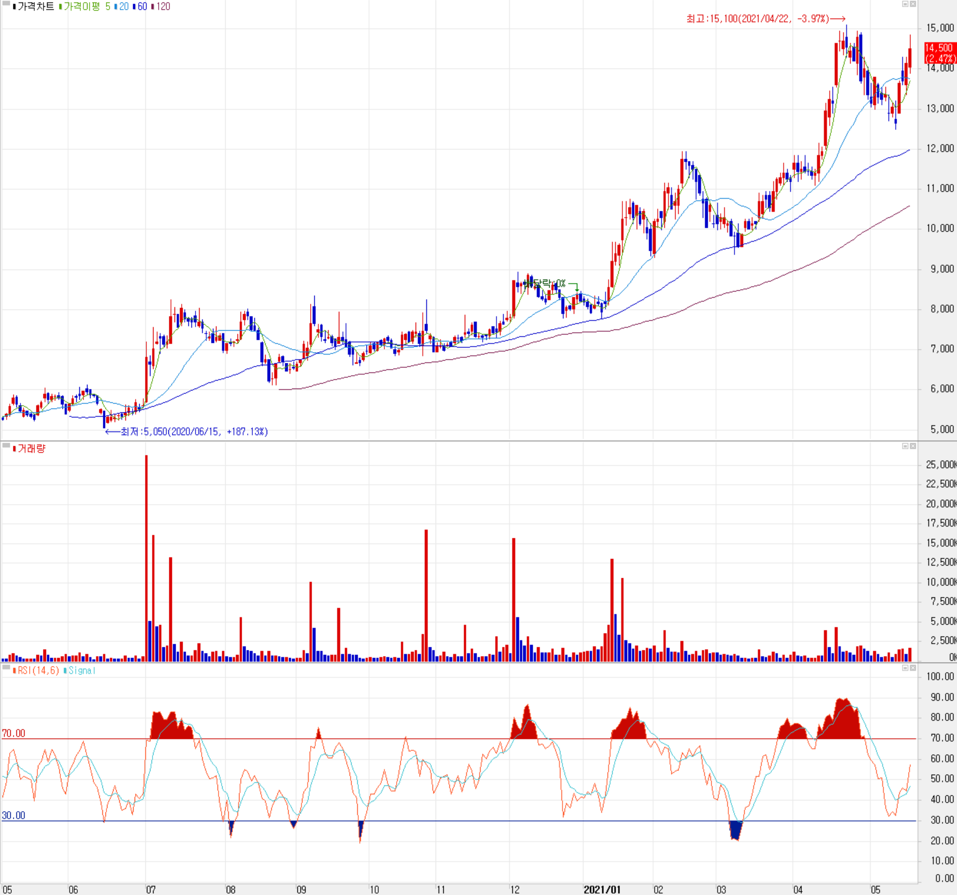 5월 20일 장 종료 기준 당사의 주가는 전 거래일 대비 2.47% 오른 14,500원에 거래를 마감했습니다. 외국인 비중은 11.02%이며 시가총액 6,996억 원으로 코스닥 시총 101위 종목입니다.