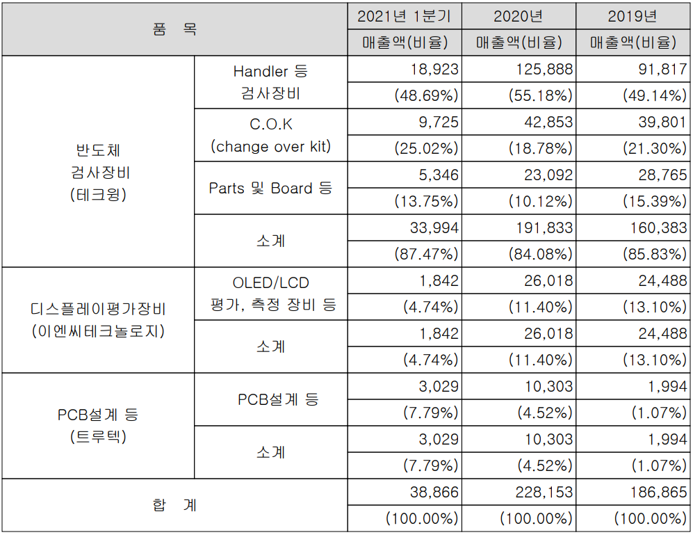 당사는 테스트 핸들러, COK(Change Over Kit) 등 반도체 후공정 및 자회사 이엔씨테크놀로지가 영위하는 디스플레이 평가 장비와 종속회사 트루텍을 통한 PCB 설계 사업을 영위하고 있습니다. 지난 1분기 반도체 검사장비 부분의 매출은 전체 매출의 87.47%를 차지하였음, 디스플레이 평가 장비 부문은 4.74%, PCB 설계 부문은 7.79%의 매출 비중을 나타냈습니다.