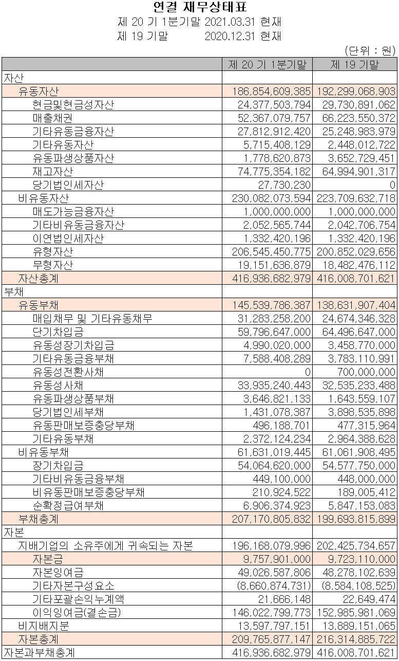 지난 1분기 말 기준 자산총계는 전기 대비 0.2% 증가한 4,169억 원, 부채는 2,072억 원으로 3.7% 증가하였습니다. 당분기 적자로 인해 자본총계는 3% 감소한 2,097억 원을 기록하였습니다.