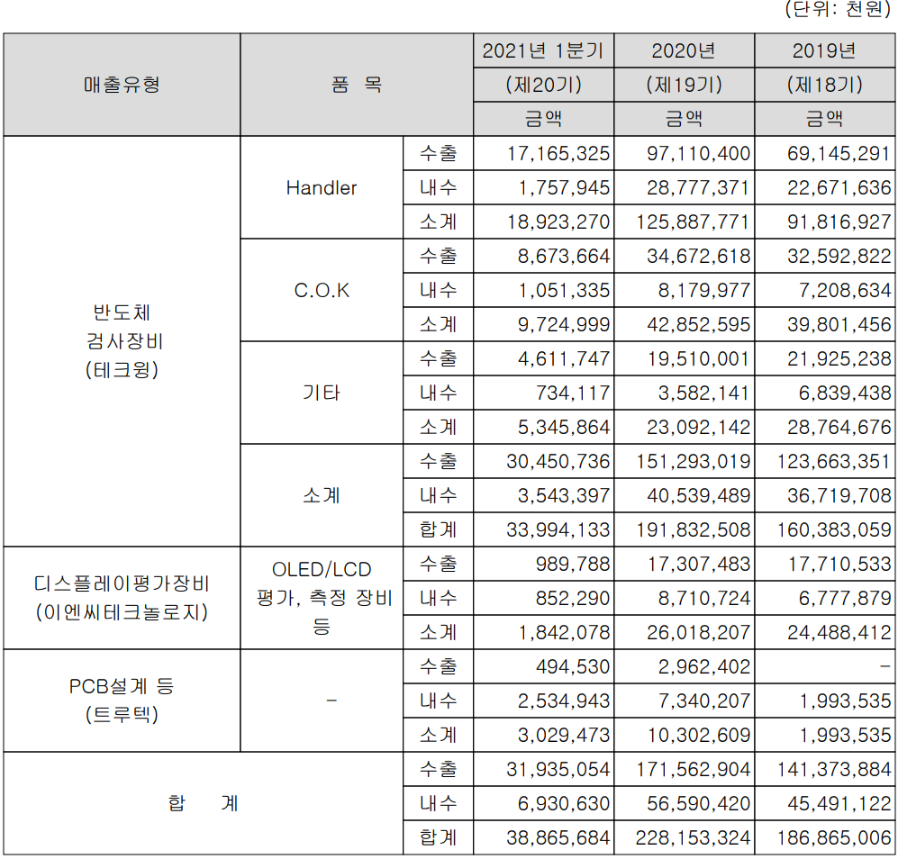 당사는 테스트 핸들러, COK(Change Over Kit) 등 반도체 후공정 및 자회사 이엔씨테크놀로지가 영위하는 디스플레이 평가 장비와 종속회사 트루텍을 통한 PCB 설계 사업을 영위하고 있습니다. 지난 1분기 반도체 검사장비 부분의 매출은 전체 매출의 87.47%를 차지하였음, 디스플레이 평가 장비 부문은 4.74%, PCB 설계 부문은 7.79%의 매출 비중을 나타냈습니다.