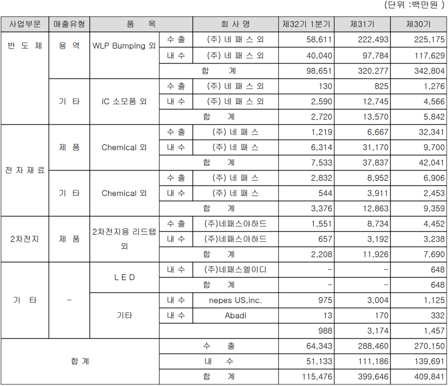 당사는 반도체 후공정에 해당되는 범핑, 플립칩, 테스트를 주력으로 전자재료와 2차전지 부품 사업부문 등으로 구성되어 있습니다. 지난 1분기 반도체 범핑 사업에서는 매출액 632억 원으로 전체 매출의 66.45%를 차지하였으며, 반도체 후공정 서비스의 전반적인 매출은 1,014억 원으로 전체 매출의 87.8%의 비중을 나타냈습니다. 디벨로퍼, EMC Chemical 등 전자재료 부문 매출은 109억 원으로 9.4%의 매출 비중을 보였으며, 2차전지 리드탭을 제조하는 (주)네패스야하드의 매출은 22억 원으로 1.9%의 매출 비중을 나타냈습니다. (내부거래 포함 비중)