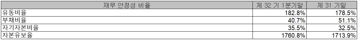 2021년 1분기 재무 안정성 비율에서는 유동비율 182.8%, 부채비율 40.7%, 자기자본비율 35.5%, 자본 유보율 1,760.8%를 기록하면서 전반적으로 건실하고 안정적인 재무상태를 유지하고 있습니다.