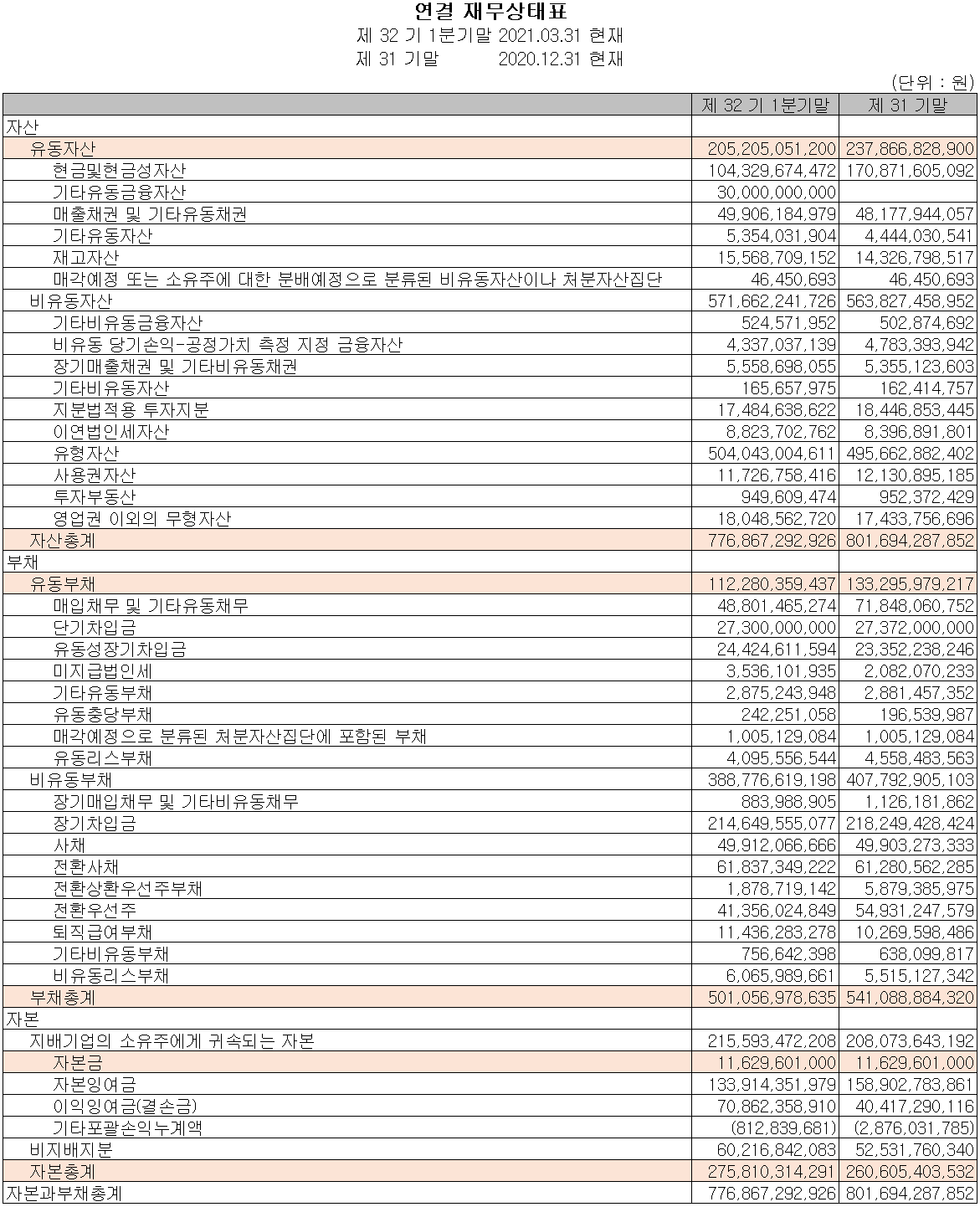 지난 1분기 자산총계는 전기보다 3.1% 감소한 7,769억 원으로 현금 및 현금성 자산의 감소에 기인합니다. 부채총계는 7.4% 감소한 5,011억 원으로 매입채무, 장기차입금 등의 감소가 주요 요인입니다.