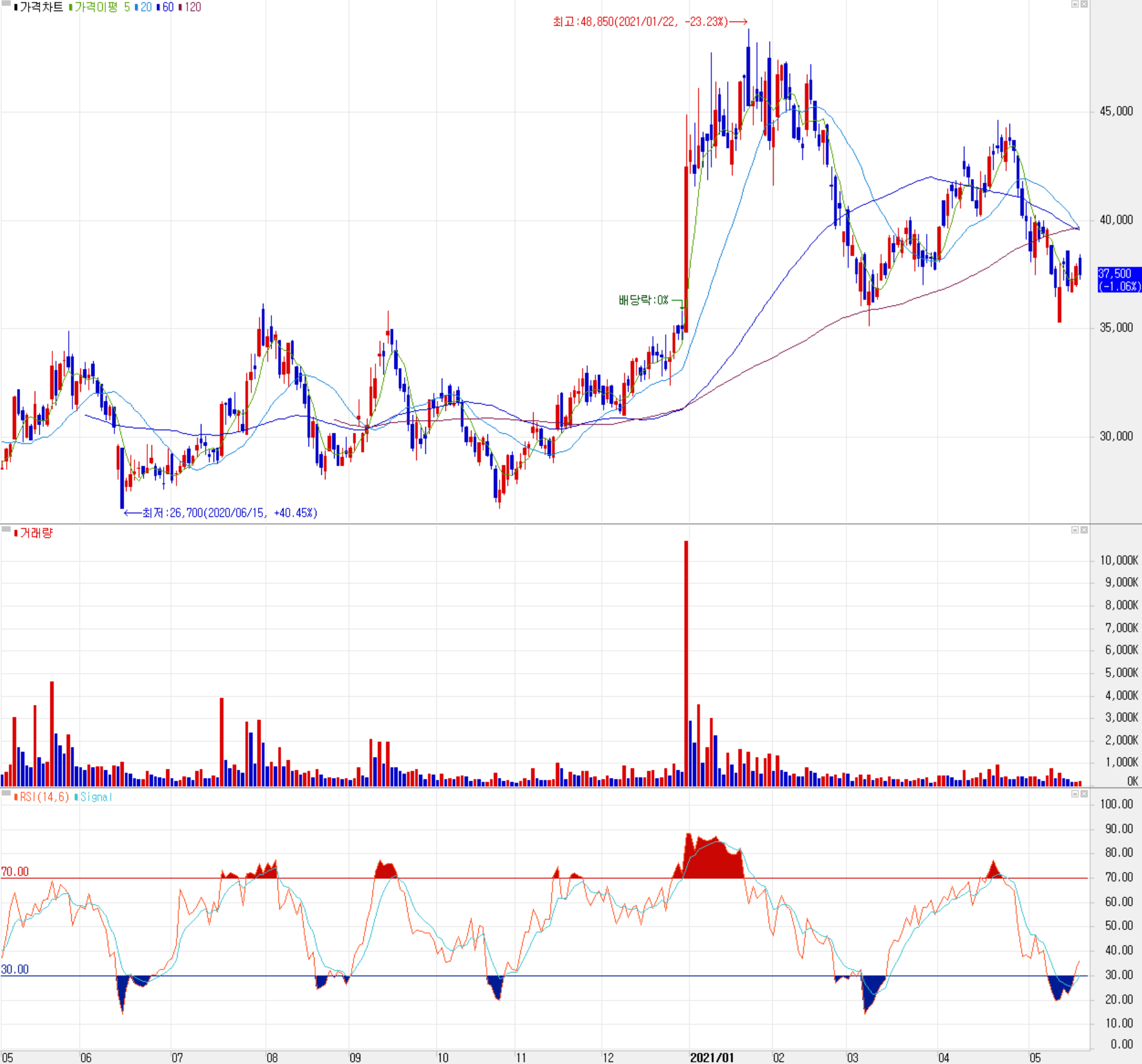 5월 21일 장 종료 기준 당사의 주가는 전일보다 1.06% 내린 37,500원에 거래를 마감했습니다. 외국인 비중은 6.85%이며, 시가 총액 8,647억 원으로 코스닥 시총 74위 종목입니다.