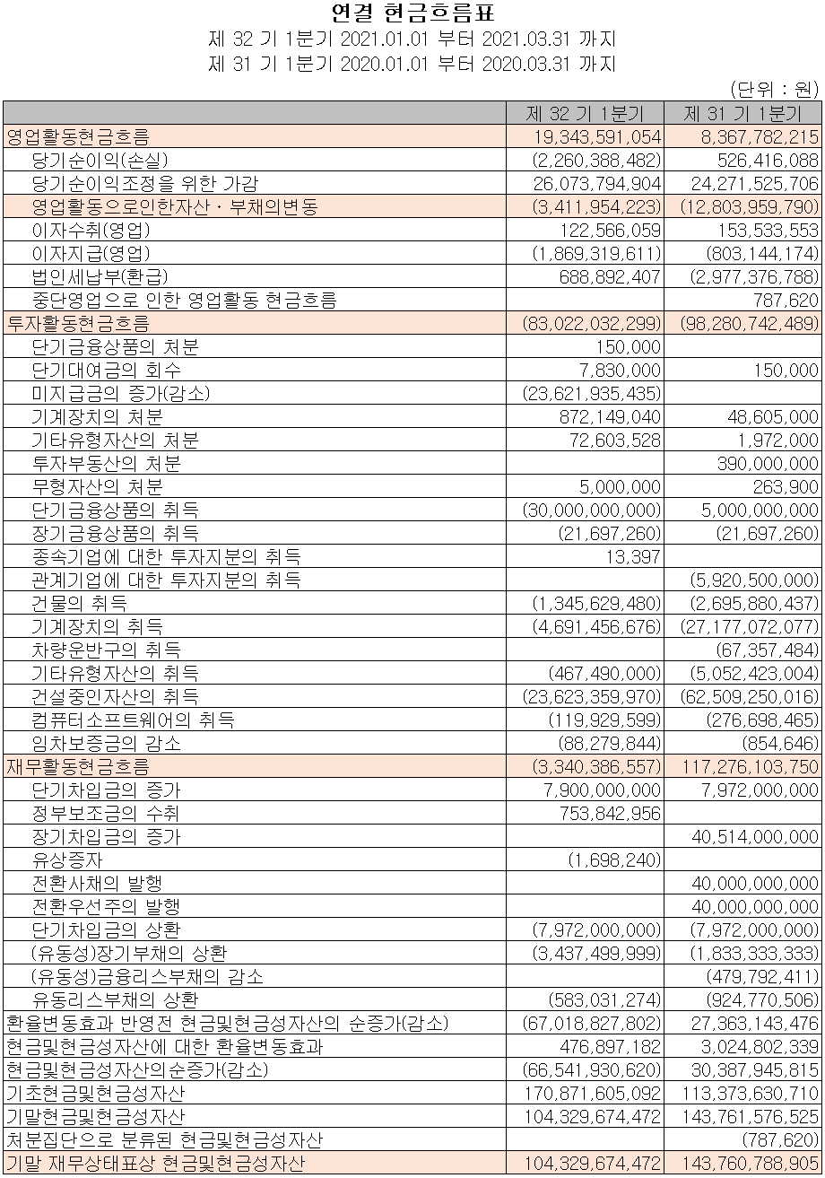 지난 1분기 영업활동 현금흐름은 당기순손실을 기록했으나, 감가상각비용 등 당기순이익 조정을 위한 가감으로 총 193억 원의 현금이 유입되었습니다. 차입금 및 정부보조금으로 자금을 조달하여 부채를 상환하고, 유무형 자산에 투자하였습니다. 2021년 1분기 말 기준 현금 및 현금성 자산은 1,043억 원입니다.