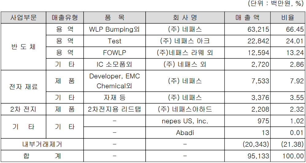 당사는 반도체 후공정에 해당되는 범핑, 플립칩, 테스트를 주력으로 전자재료와 2차전지 부품 사업부문 등으로 구성되어 있습니다. 지난 1분기 반도체 범핑 사업에서는 매출액 632억 원으로 전체 매출의 66.45%를 차지하였으며, 반도체 후공정 서비스의 전반적인 매출은 1,014억 원으로 전체 매출의 87.8%의 비중을 나타냈습니다. 디벨로퍼, EMC Chemical 등 전자재료 부문 매출은 109억 원으로 9.4%의 매출 비중을 보였으며, 2차전지 리드탭을 제조하는 (주)네패스야하드의 매출은 22억 원으로 1.9%의 매출 비중을 나타냈습니다. (내부거래 포함 비중)