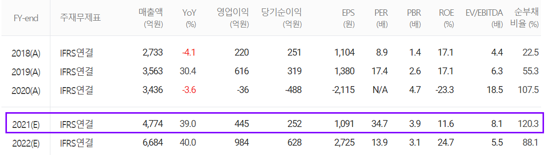 2021년 연간 컨센서스에서는 매출액 4,774억 원으로 전년 대비 39% 증가하고, 영업이익은 445억 원, 당기순이익은 252억 원을 기록하면서 흑자 전환할것으로 추정했습니다.