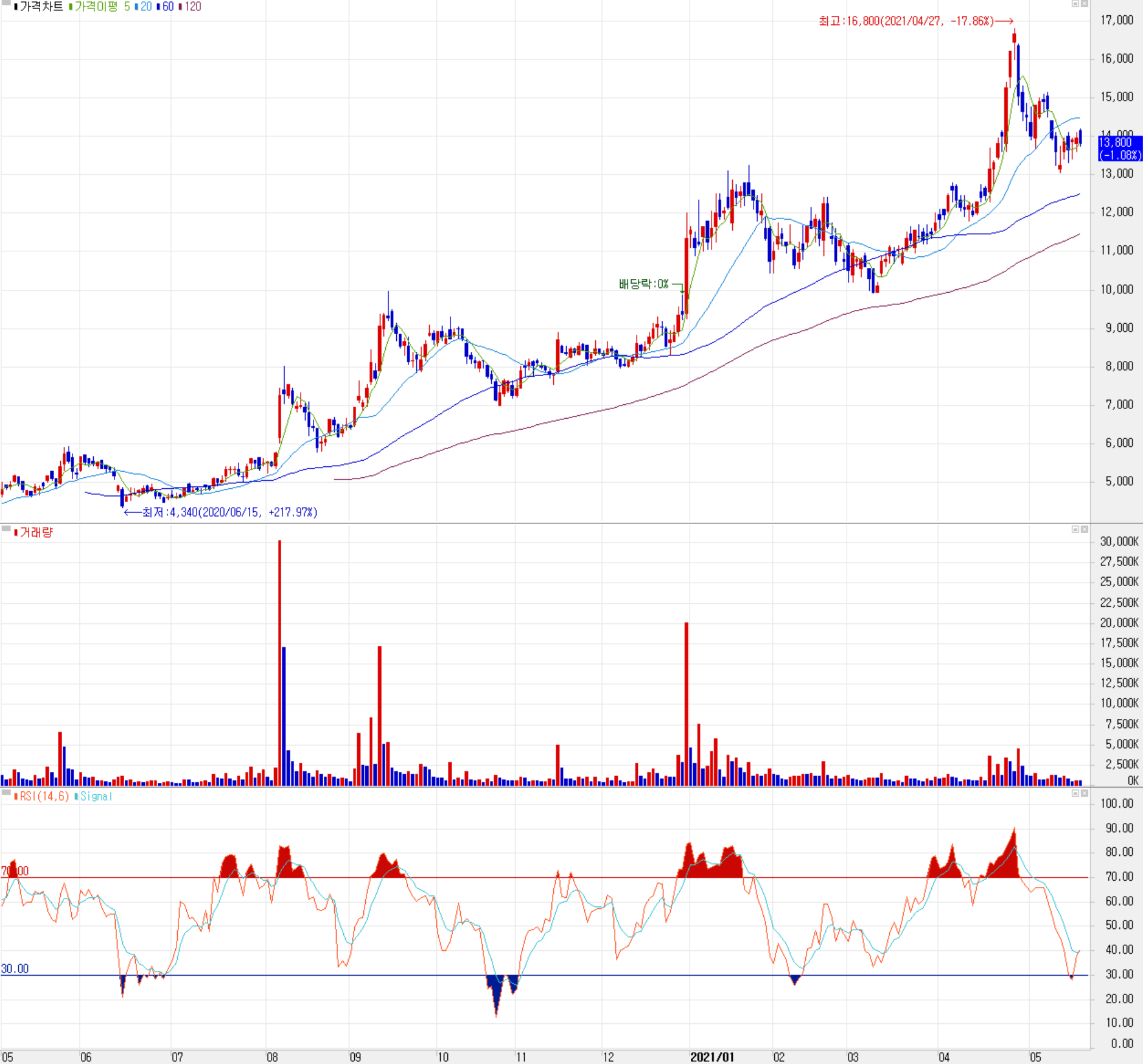 지난 5월 21일 당사의 주가는 전 거래일보다 1.08% 내린 13,800원에 거래를 마쳤습니다. 외국인 비중은 3.26%이며, 시가 총액 4,407억 원으로 코스닥 시총 193위 종목입니다.