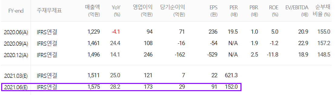 당사의 2021년 2분기 예상 실적은 1,575억 원으로 전년 동기 대비 28.2% 증가하고, 영업이익은 173억 원으로 84% 증가, 당기순이익은 29억 원으로 59% 감소할 것으로 내다봤습니다.