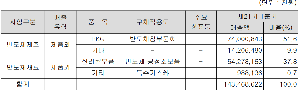 당사의 사업부문은 반도체 사업 단일 부문으로서 크게 반도체 패키징과 자회사인 하나머티리얼즈 등이 영위하는 실리콘, 특수가스 등 반도체 공정에 적용되는 반도체 재료 사업으로 구분됩니다. 지난 1분기 반도체 패키징 및 기타 검사 등의 반도체 제조 사업부문에서는 전체 매출의 61.5%인 882억 원을 기록했으며, 반도체 재료 부문에서는 552억 원의 매출로 38.5%의 비중을 차지하였습니다.