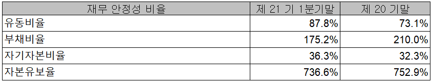 2021년 1분기 재무 안정성 비율에서는 유동비율 87.8%, 부채비율 175.2%, 자기 자본비율 36.3%, 자본 유보율 736.6%를 기록하였습니다. 부채비율이 높은 편이지만 지난해 신규사업인 서버 DRAM의 플립칩 패키징 사업과 삼성전자 LSI의 AP, RF, PMIC 칩 등의 파이널 테스트 사업을 시작하면서 향후 전반적인 실적 개선과 함께 재무상태로 호전될 것으로 예상됩니다.
