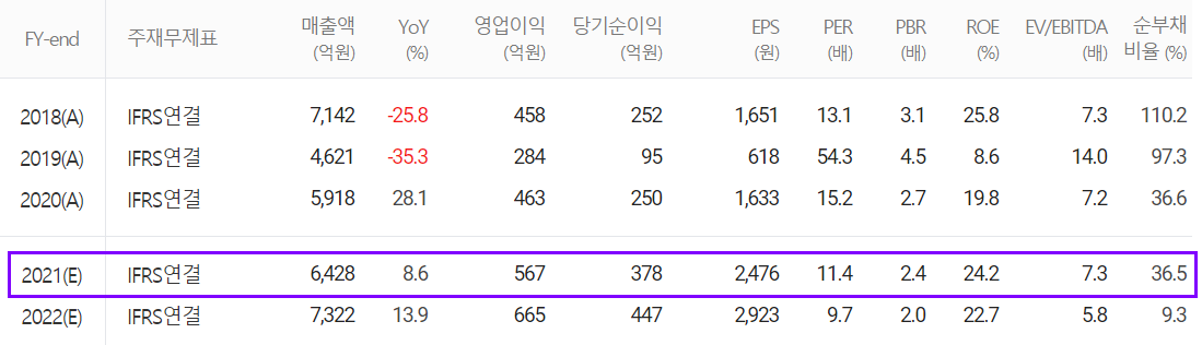 2021년 연간 예상실적은 매출액 6,428억 원으로 전년 대비 8.6% 증가하고, 영업이익은 567억 원으로 23.8% 증가할 것으로 추정했습니다.