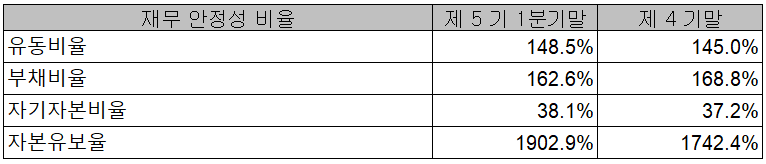 지난 1분기 당사의 재무 안정성 비율에서는 유동비율 148.5%, 부채비율 162.6%, 자기자본비율 38.1%, 자본 유보율 1,902.9%를 기록하였습니다. 부채비율이 높은 편이지만 2017년 423%에서 점차 감소 추세에 있으며, 실적 개선에 따라 기타 재무상태도 점차 안정적인 추세를 나타내고 있습니다.