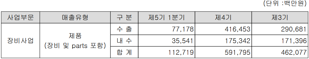 당사는 디스플레이 제조 공정 중 봉지 공정 장비인 Encap, LTPS 결정화용 핵심 장비인 ELA(Excimer Laser Annealing) 그리고 AMOLED 패널 제작에서 박막분리 장비인 LLO(Laser Lift Off) 장비 등이 있으며, 반도체 제조 부문에는 웨이퍼 급속 열처리 장비인 RTP 장비를 제조 공급하고 있습니다. 지난 1분기 당사의 주력 제품인 디스플레이 제조장비 부문의 매출은 1,017억 원으로 전체 매출의 90.2%를 차지하였으며, 반도체 제조장비의 경운 94억 원으로 8.4%의 매출 비중을 나타냈습니다.