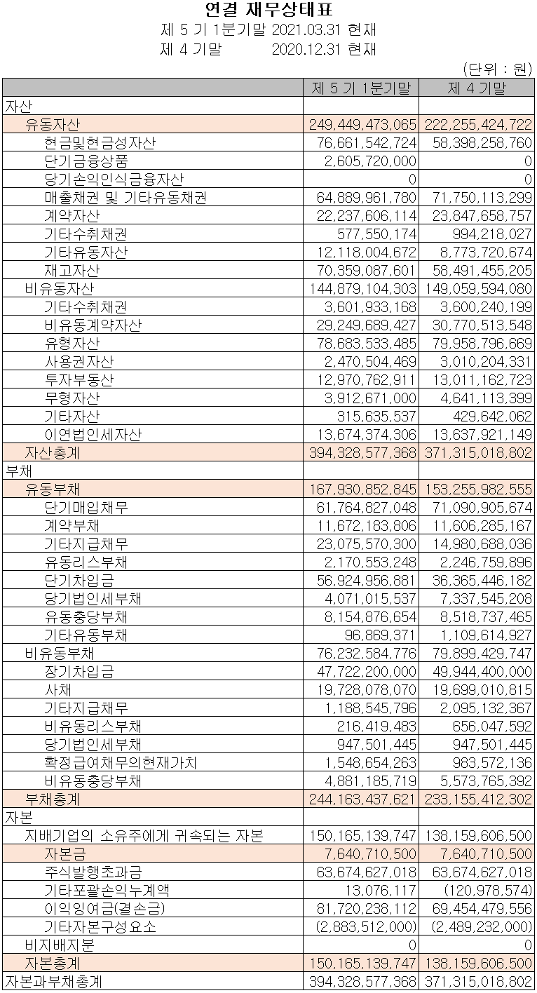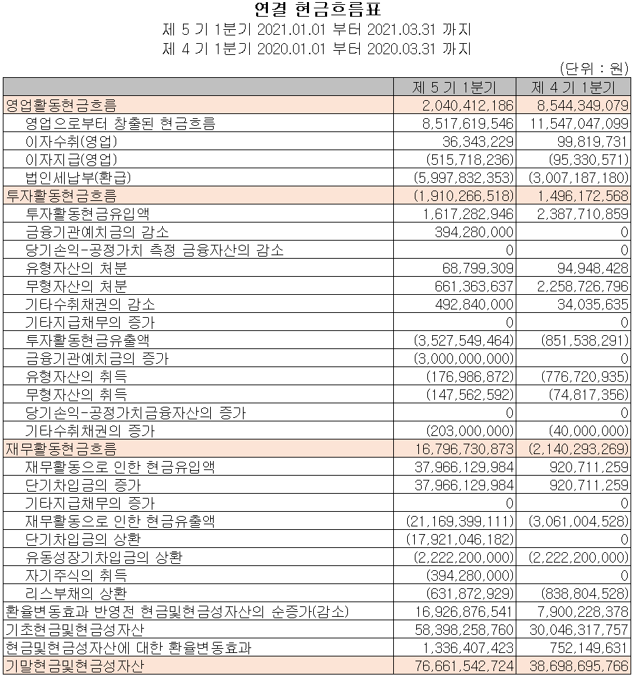 지난 1분기 영업활동 현금흐름에서는 총 20억 원의 현금이 유입되었으며, 차입금을 조달하여 부채를 상환하고, 자기주식을 취득하였습니다. 2021년 1분기 말 기준 현금 및 현금성 자산은 전년 동기 대비 380억 원이 증가한 767억 원입니다.