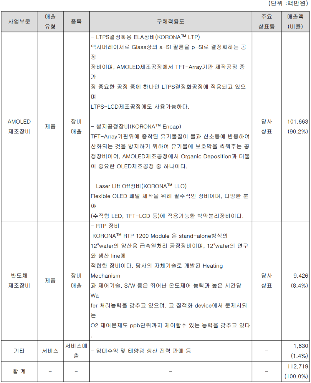 당사는 디스플레이 제조 공정 중 봉지 공정 장비인 Encap, LTPS 결정화용 핵심 장비인 ELA(Excimer Laser Annealing) 그리고 AMOLED 패널 제작에서 박막분리 장비인 LLO(Laser Lift Off) 장비 등이 있으며, 반도체 제조 부문에는 웨이퍼 급속 열처리 장비인 RTP 장비를 제조 공급하고 있습니다. 지난 1분기 당사의 주력 제품인 디스플레이 제조장비 부문의 매출은 1,017억 원으로 전체 매출의 90.2%를 차지하였으며, 반도체 제조장비의 경운 94억 원으로 8.4%의 매출 비중을 나타냈습니다.