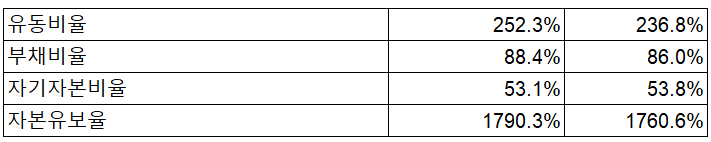 당사의 2021년 1분기 재무 안정성 비율에서는 유동비율 252.3%, 부채비율 88.4%, 자기 자본비율 53.1%, 자본 유보율 1,790.3%를 기록하면서 양호한 재무상태를 유지하고 있습니다.