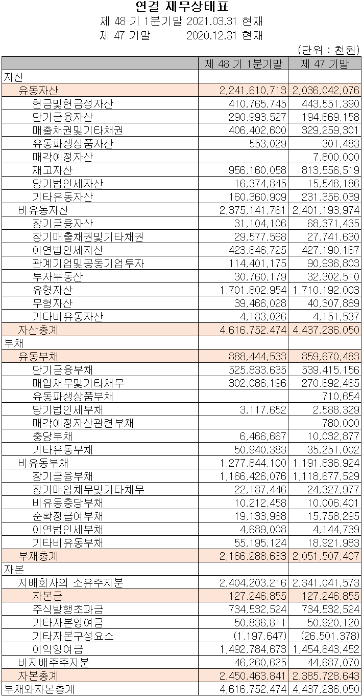 2021년 1분기 말 기준 자산총계는 전기보다 4%(1,795억) 증가한 4조 6,168억 원으로 단기금융자산, 매출채권 및 재고자산의 증가에 기인합니다. 부채는 전기 대비 5.6%(1,148억) 증가한 2조 1,663억 원으로 매입채무 및 장단기 차입금의 증가가 주요 요인입니다. 순이익의 증가로 인해 자본총계도 전기 대비 647억 원이 증가한 2조 4,505억 원을 기록했습니다.