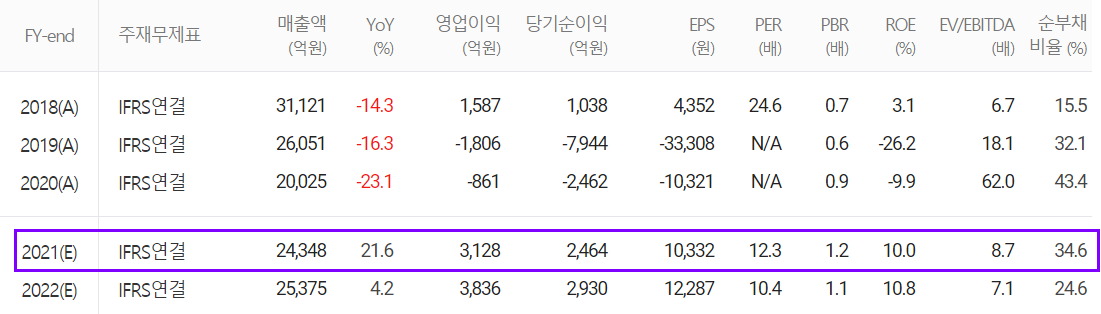 당사의 2021년 예상실적은 매출액 2조 4,348억 원으로 전년 대비 21.6% 증가하고, 영업이익과 당기순이익은 각각 3,128억 원, 2,464억 원으로 흑자 전환할 것으로 내다봤습니다.