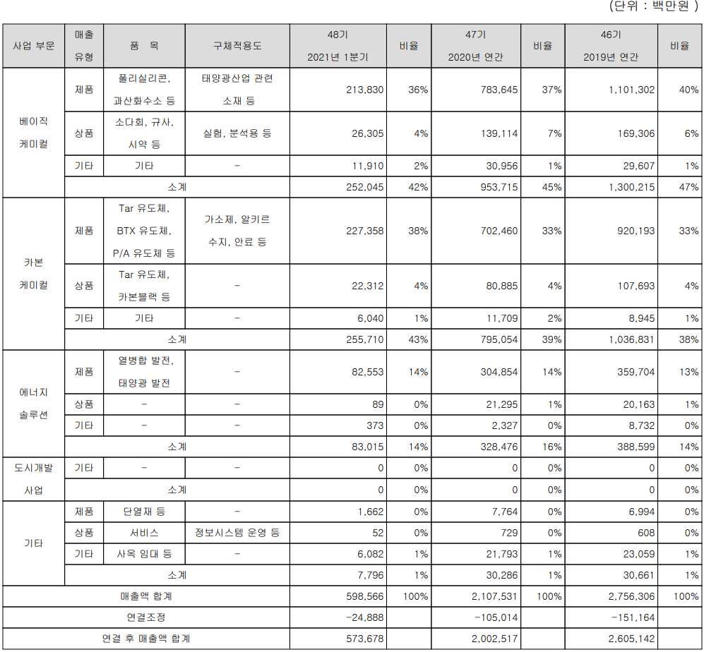 당사의 사업부문에는 태양관 산업에 필수 소재인 폴리실리콘과 반도체 세정, 신문, 섬유표백, 자동차, 신발 가구 등 일상생활에 다양하게 적용되는 과산화수소 등의 베이식 케미컬 사업부문이 있으며, 석탄 석유화학 제품용으로 사용되는 카본 케미컬 사업 그리고 열병합 및 태양광 발전 관련 에너지 솔루션 사업이 주를 이루고 있습니다. 지난 1분기 베이직 케미컬 사업 부문의 매출은 2,520억 원으로 전체 매출의 42%를 차지했고, 카본 케미컬은 2,557억 원으로 43%, 에너지솔루션은 830억 원으로 14%의 매출 비중을 나타냈습니다.