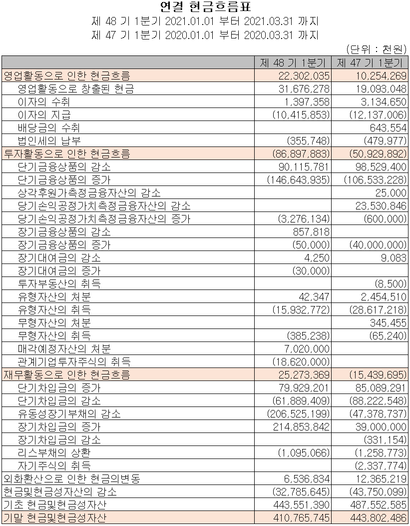 지난 1분기 영업활동 현금흐름은초 223억 원의 현금이 유입되었으며, 장단기 차입금을 조달하여 부채를 상환하고 유형자산 등을 취득하였습니다. 2021년 1분기 말 기준 현금 및 현금성 자산은 전년 동기 대비 330억 원 감소한 4,108억 원입니다.