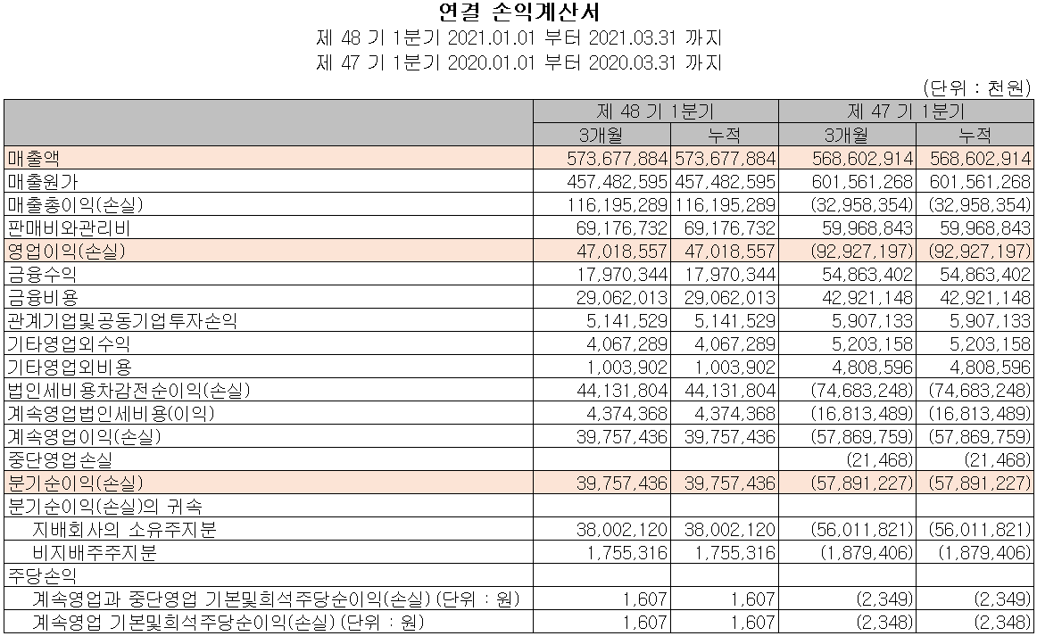 지난 1분기 당사의 실적은 매출액 5,737억 원으로 전년 동기 대비 0.9% 증가했고, 영업이익과 당기순이익은 각각 470억 원, 0.4억 원으로 흑자 전환했습니다.