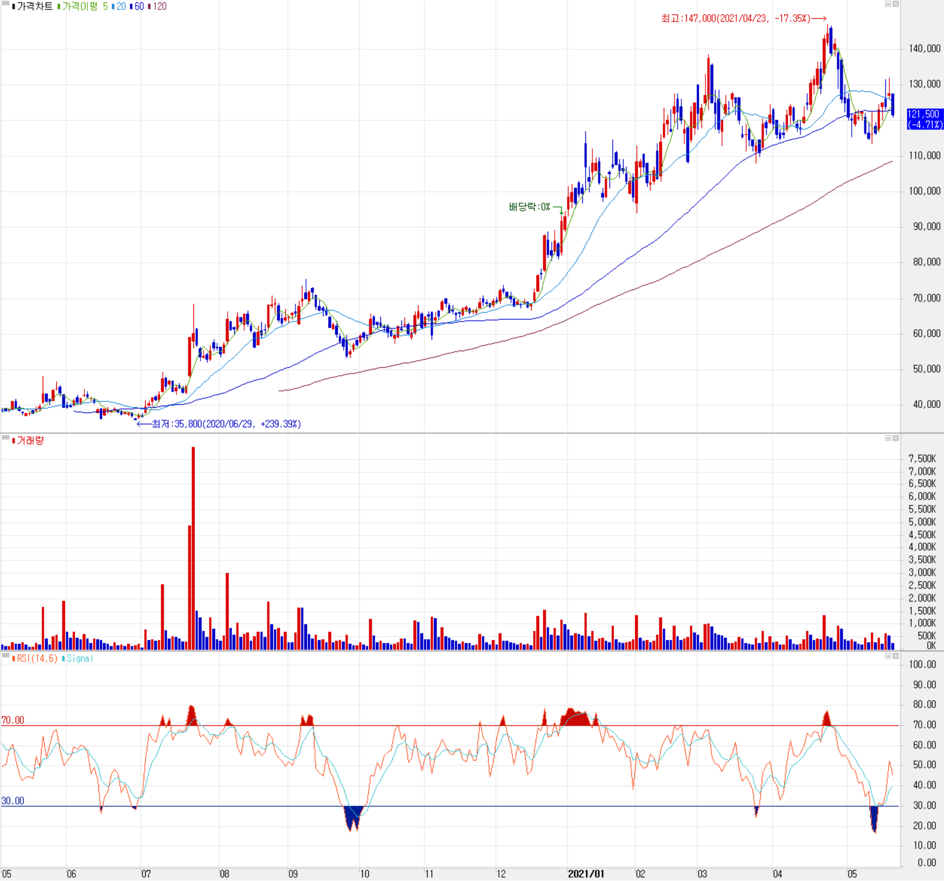 5월 24일 장 종료 기준 당사의 주가는 전 거래일보다 5.71% 내린 121,500원에 거래를 마쳤습니다. 외국인 비중은 19.74%이며, 시가 총액은 2조 8,977억 원으로 코스피 시총 111위 종목입니다.