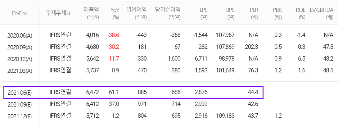 당사의 2021년 2분기 예상 실적은 매출액 6,472억 원으로 전년 동기 대비 61.1% 증가하고, 영업이익은 885억 원, 당기순이익은 686억 원으로 흑자 전환할 것으로 추정했습니다.