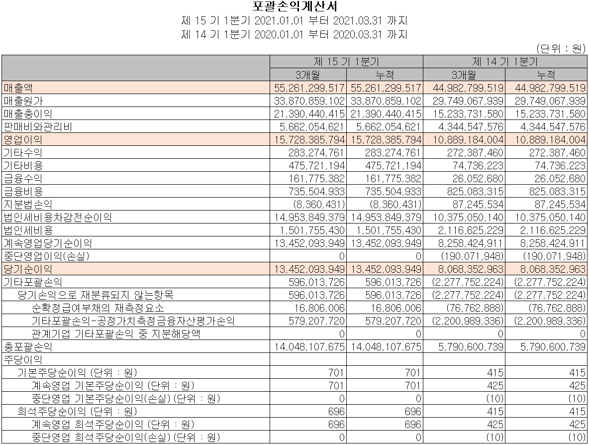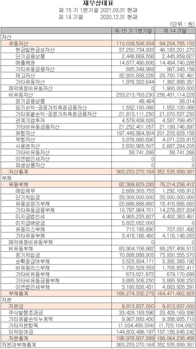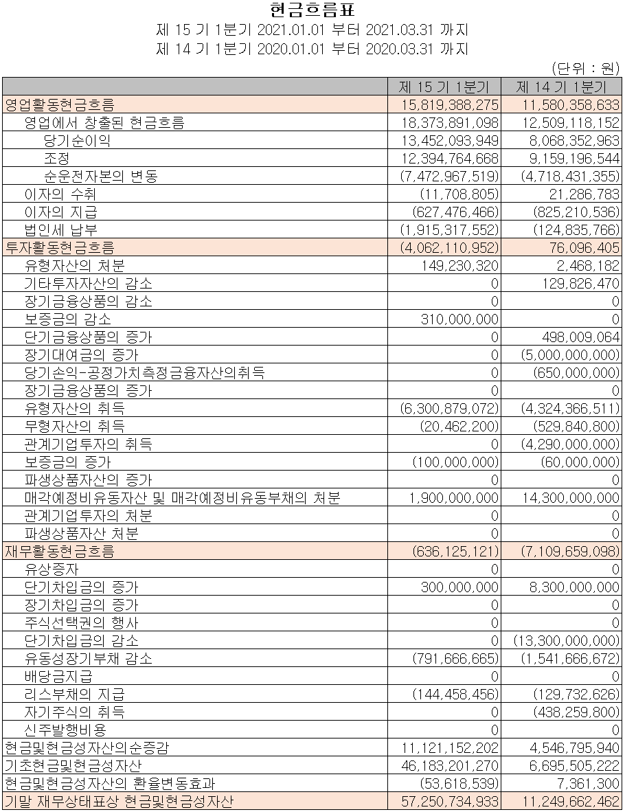 지난 1분기 영업활동 현금흐름은 분기순이익의 증가 등으로 전년 동기보다 42억 원이 늘어난 158억 원의 현금이 유입되었습니다. 신규 사업 진출을 위한 유무형 자산에 투자를 수행하였고, 차입금은 전년 동기 대비 대폭 줄어든 3억 원을 조달하여 부채의 상환 및 배당금을 지급하였습니다. 2021년 1분기 당사의 현금 및 현금성 자산은 전년 동기 대비 460억 원이 증가한 573억 원을 기록했습니다.