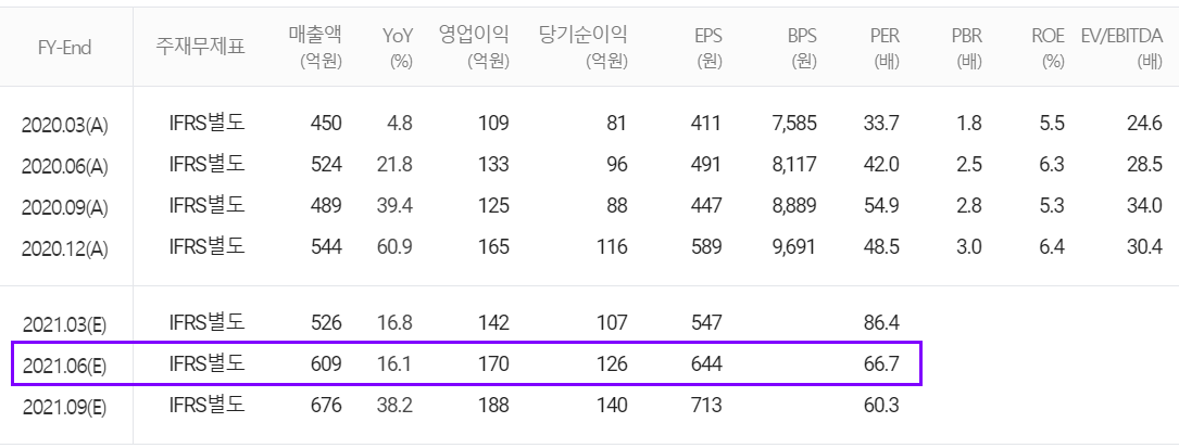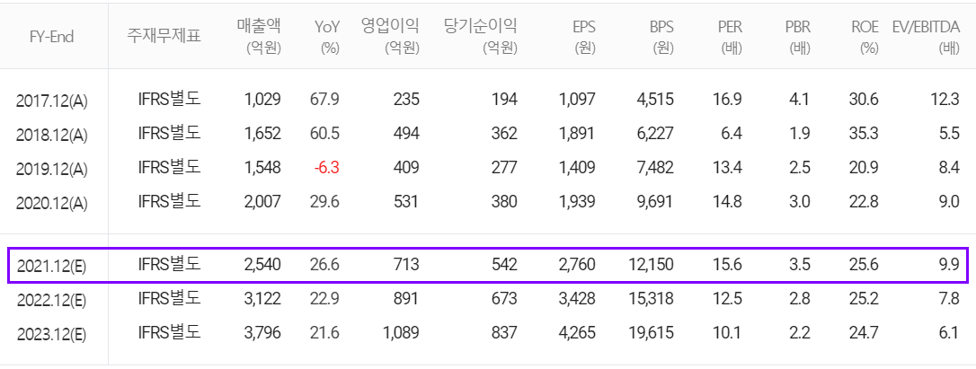 당사의 2021년 예상 실적에서는 매출액 2,540억 원으로 저년 대비 26.6% 증가하고, 영업이익은 713억 원으로 34.3% 증가할 것으로 추정했습니다.