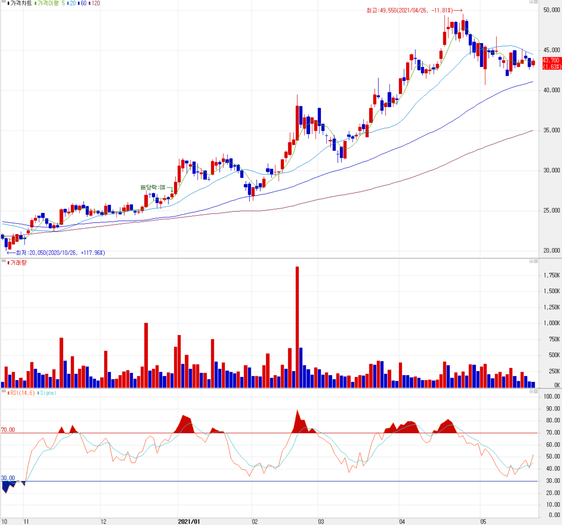 5월 25일 장종료 기준 당사의 주가는 전일보다 1.63% 오른 43,700원에 거래를 마쳤습니다. 외국인 비중은 24.91%로 높은 편이며, 시가 총액 8,579억 원으로 코스닥 시총 72위 종목입니다.