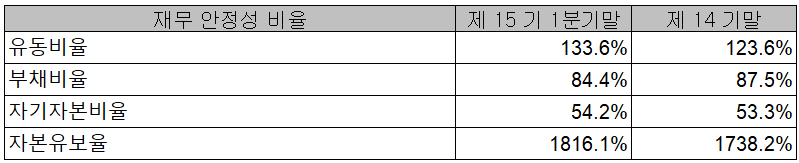 당사의 2021년 1분기 재무 안정성 비율에서는 유동비율 133.6%, 부채비율 84.4%, 자기자본비율 54.2%, 자본 유보율 1,816.1%를 기록하면서 건실하고 안정적인 재무상태를 유지하고 있습니다.