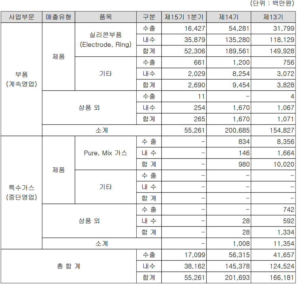 당사의 사업부문은 반도체 식각 장비에 적용되는 공정 구조 부품인 실리콘 계 부품 사업 단일 사업부문입니다. 실리콘 계 부품에는 Electrode, Ring 등의 소모성 구조 기능성 부품 등이 있으면 CVD SiC 부품의 개발로 신규 매출 확대가 예상됩니다.