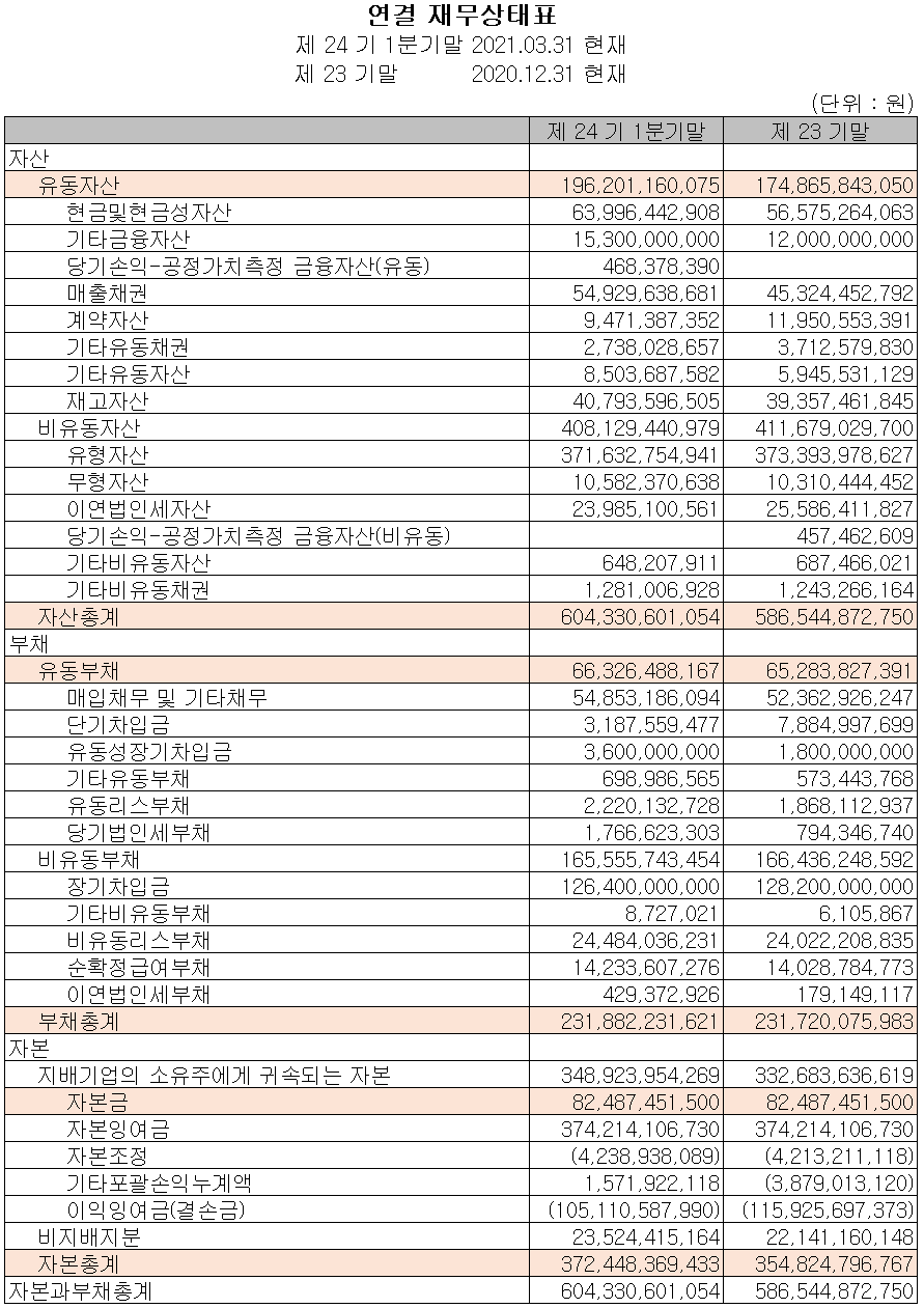 1분기 말 기준 당사의 자산총계는 전기보다 178억 원 증가한 6,043억 원으로 현금 및 현금성 자산, 매출 채권 등의 증가에 기인합니다. 부채총계는 1.6억 원 증가하는데 그쳤습니다.