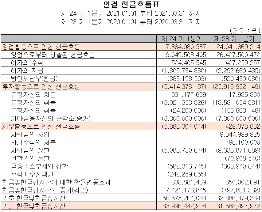 지난 1분기 영업활동 현금흐름은 총 179억 원의 현금이 유입되었으며, 차입금 조달 없이 부채를 상환하였습니다. 2021년 1분기 말 기준 현금 및 현금성 자산은 640억 원입니다.