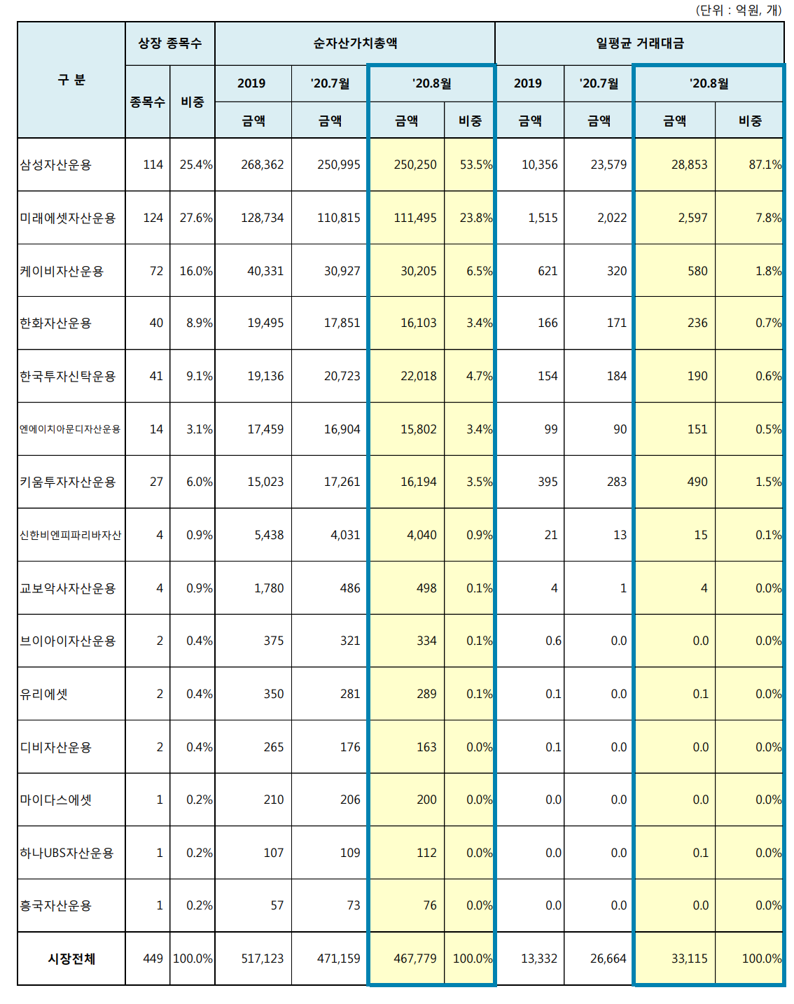 참고로 국내 ETF 운용사는 15개사로 총 449개의 종목이 상장되어 있고 순자산가치(NAV) 기준으로 삼성자산운용의 규모가 가장 큽니다.