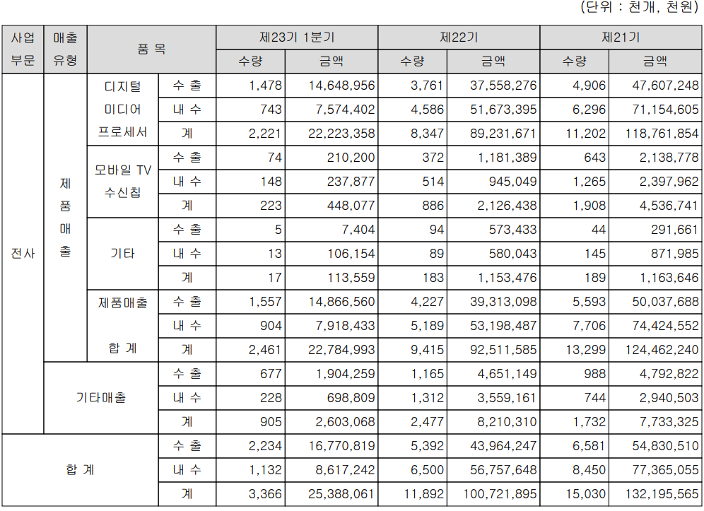 당사는 Intelligent Automotive Solution과 Smart Home Solution에 적용되는 AP(Applcation Processor)와 DMP(Digital Media Process) 제조 기술을 확보하고 이를 응용한 스마트 기기, 자율주행 차량 및 모바일 TV 수신 칩 등을 제조, 공급하고 있습니다. 지난 1분기 DMP 매출은 222억 원으로 전체 매출의 87.53%를 차지하였으며, Mobile TV 수신칩은 4.5억 원으로 1.76%의 매출 비중을 나타냈습니다.