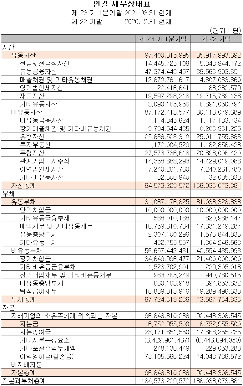지난 1분기 자산총계는 전기 대비 185억 원이 증가한 1,846억 원으로 현금 및 현금성 자산과 단기금융자산 및 유형자산의 증가가 주된 요인입니다. 부채는 141억 원 증가한 877억 원으로 장기차입금의 증가에 기인합니다.