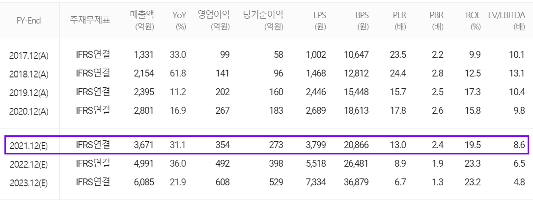 2021년 연간 예상 실적에서는 매출액 3,671억 원으로 전년 대비 31.1% 증가하고, 영업이익은 354억 원으로 32.6% 증가할것으로 추정했습니다.