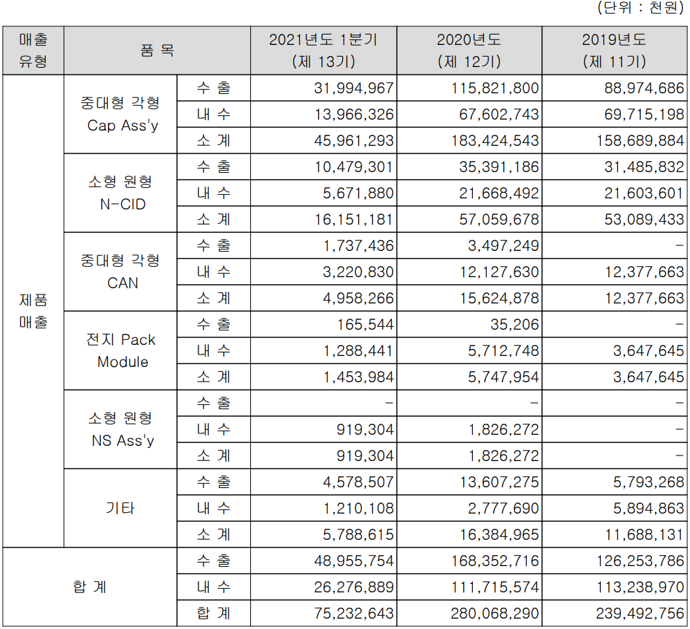 당사는 전기자동차 및 다양한 전자제품에 적용되는 2차전지용 부품을 제조하는 단일 사업부문으로 구성되어 있습니다. 지난 1분기 2차전지에 사용되는 중대형 각형 CAP의 매출은 460억 원으로 61.09%의 매출 비중을 기록했고, 소형 원형 CID는 162억 원으로 21.47%, 중대형 각형 CAN은 50억 원으로 6.59%, 전지 팩 모듈은 15억 원으로 1.93% 그리고 무선 이어폰에 사용되는 소형 원형 NS Ass'y는 9억 원의 매출로 1.22%의 비중을 나타냈습니다.