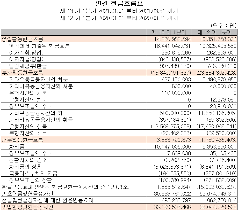지난 1분기 영업활동 현금흐름에서는 전년 동기보다 45억 원 증가한 149억 원의 현금이 유입되었습니다. 차입금을 조달하였고, 정부보조금을 수취하여 부채를 상환하고, 유무형 자산에 투자하였습니다. 2021년 1분기 말 기준 현금 및 현금성 자산은 332억 원입니다.