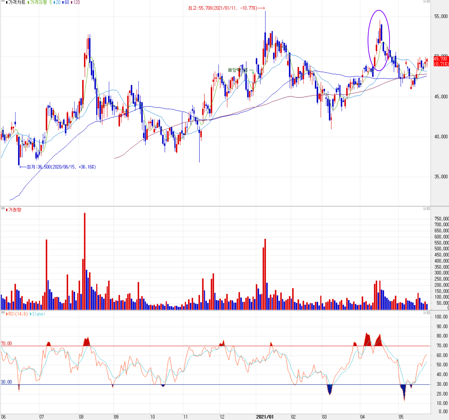 지난 1월 초 장중 최고가인 55,700원을 기록한 당사의 주가는 이후 조정을 받다가 3월 들어서면서 반등을 시작하여 4월 중순에는 당사의 주 고객사인 삼성SDI가 제2의 테슬라로 불리는 미국 전기차 스타트업 기업인 '리비안'에 배터리를 공급한다는 소식이 전해지면서 급등하였고 이후 조정을 받다가 최근 반등하는 모습입니다. 최근 한 달간 수급에서는 개인이 13 거래일 연속 순매수한 이후 기관이 바통을 이어받아 최근 5 거래일 연속 기관의 순매수 행진이 이어지는 상황을 보이는 중입니다. 지난 4월 초 분석 글에서 설정한 개인적인 목표주가 58,000원은 그대로 유지할 예정입니다.