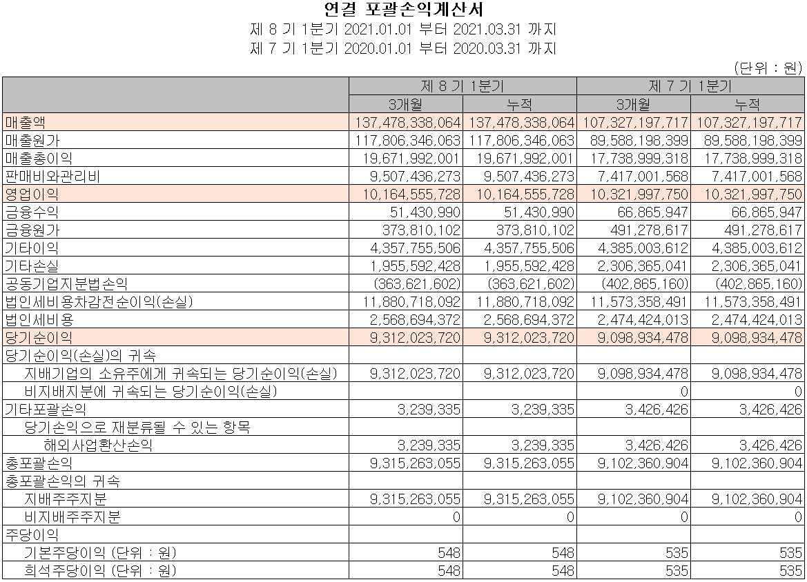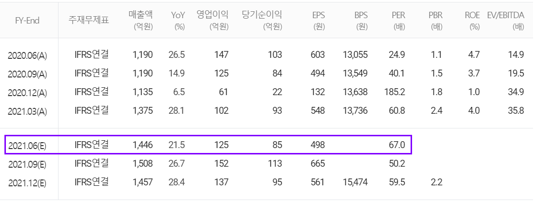 2021년 연간 예상 실적에서는 매출액 5,842억 원으로 전년 대비 27.3% 증가하고, 영업이익은 526억 원으로 20.9% 증가, 당기순이익은 390억 원으로 30% 증가할 것으로 추정했습니다.