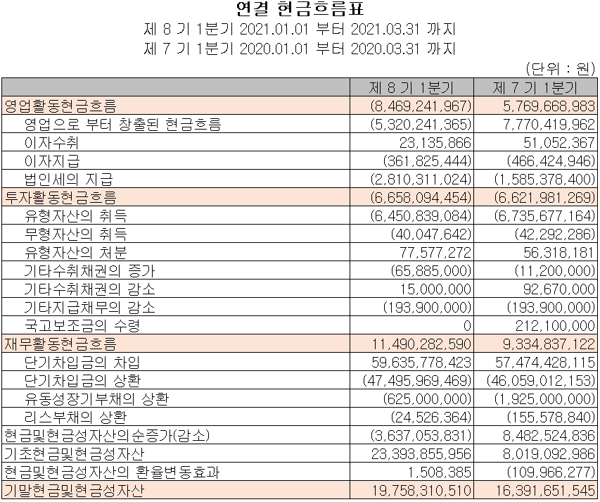 지난 1분기 영업활동 현금흐름은 총 85억 원의 현금이 유출되었으며, 차입금을 조달하여 부채를 상환하고 유형 자산 등에 투자하였습니다. 2021년 1분기 말 기준 현금 및 현금성 자산은 198억 원입니다.