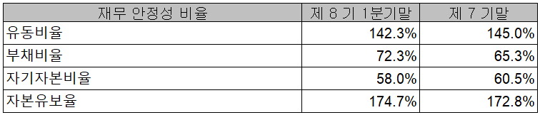 당사의 2021년 1분기 재무 안정성 비율에서는 유동비율 142.3%, 부채비율 72.3%, 자기자본비율 58%, 자본 유보율 174.7%를 기록하면서 양호한 재무상태를 유지하고 있습니다.